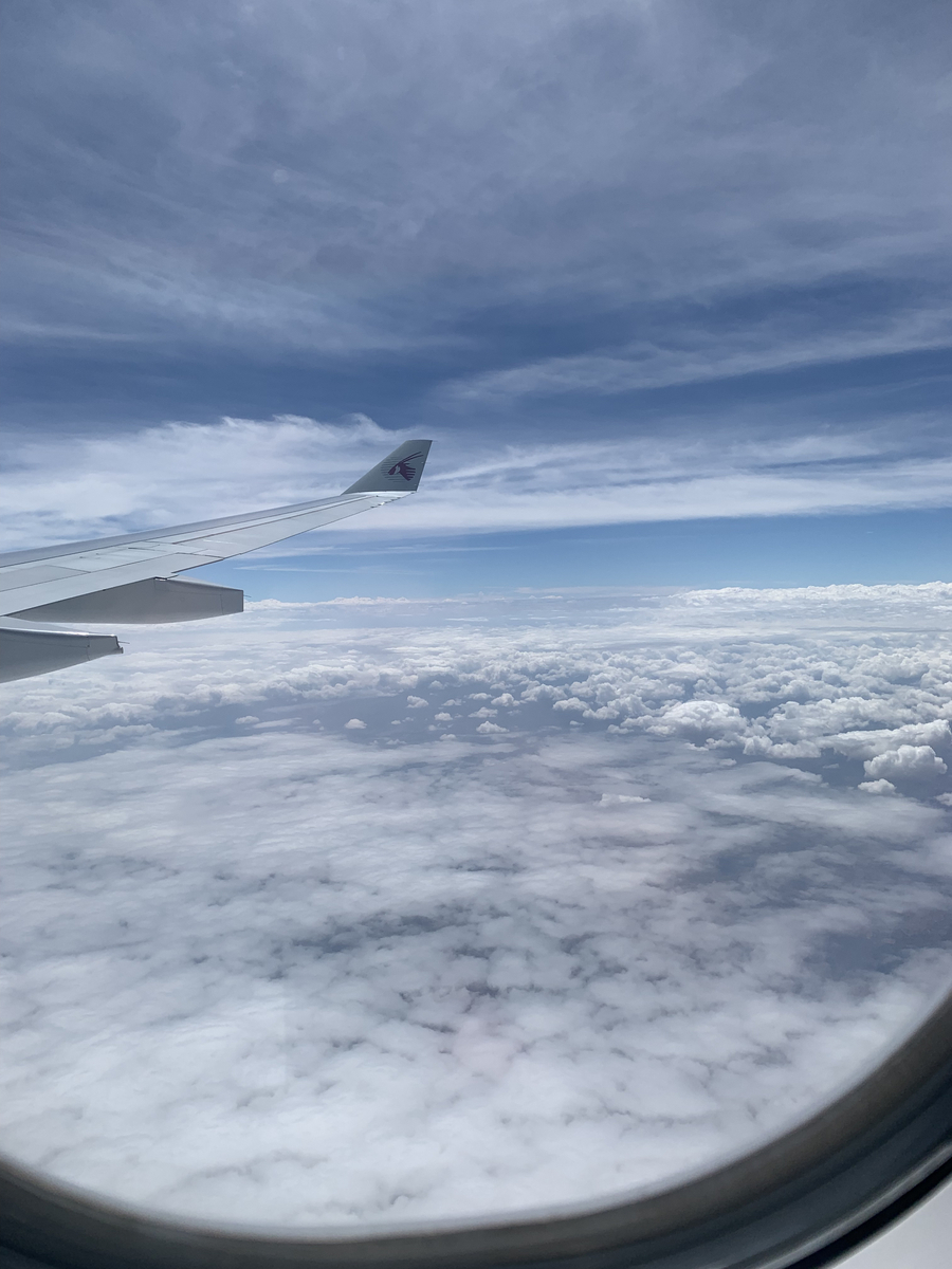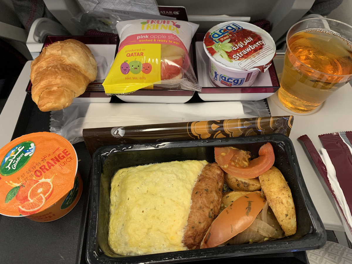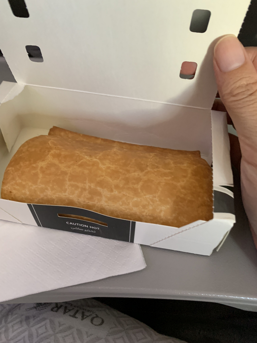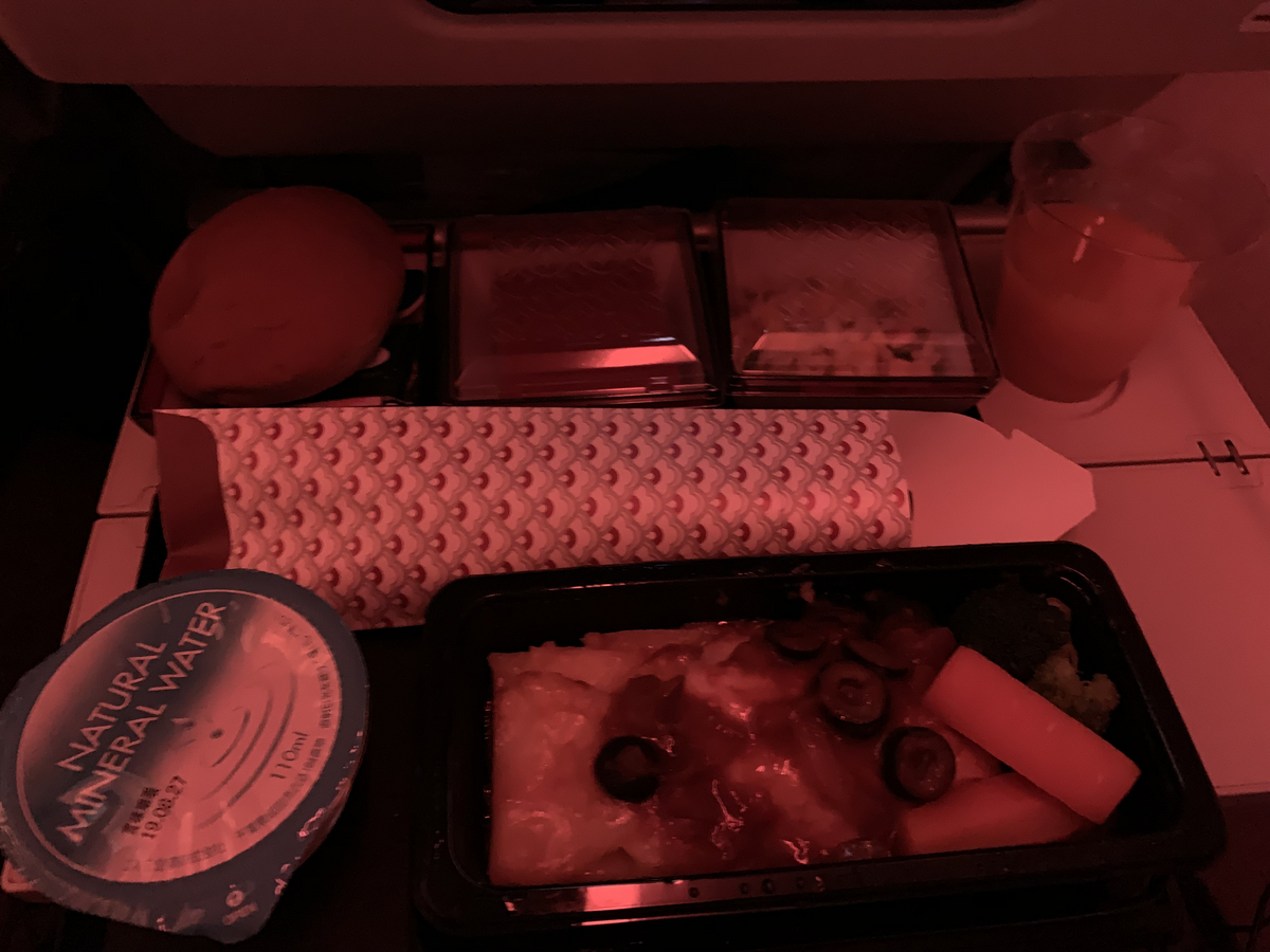 こちらはカタール航空の機内食。夜の時間なので、暗い中でご飯を食べる。このラザニアのようなものがとてもおいしかった印象。そして上の方にあるプラスチックの容器に入ったデザートも高級感があって、テンションが上がった。