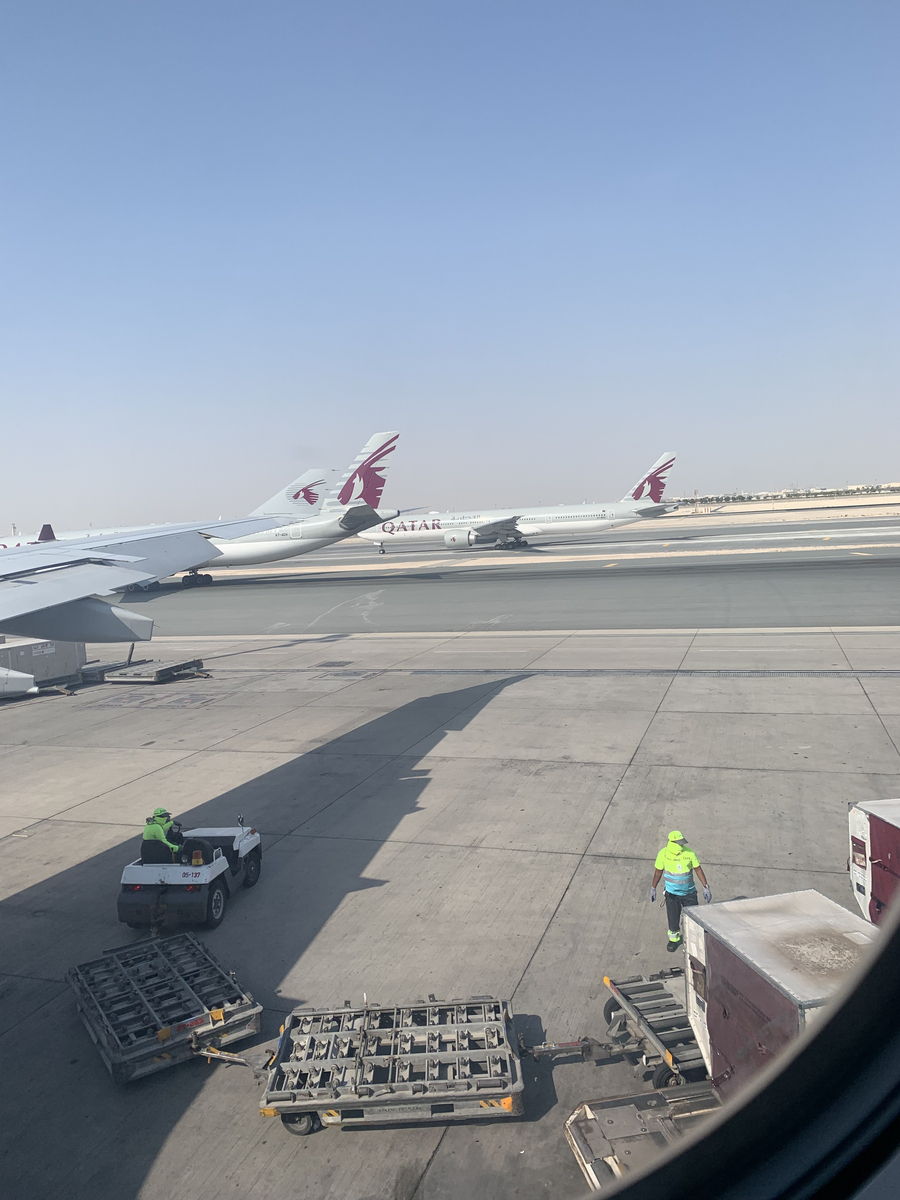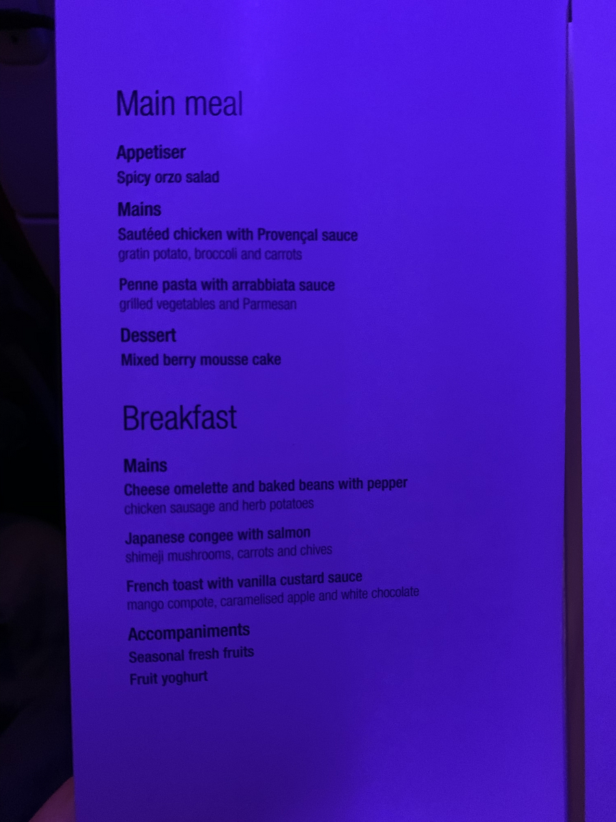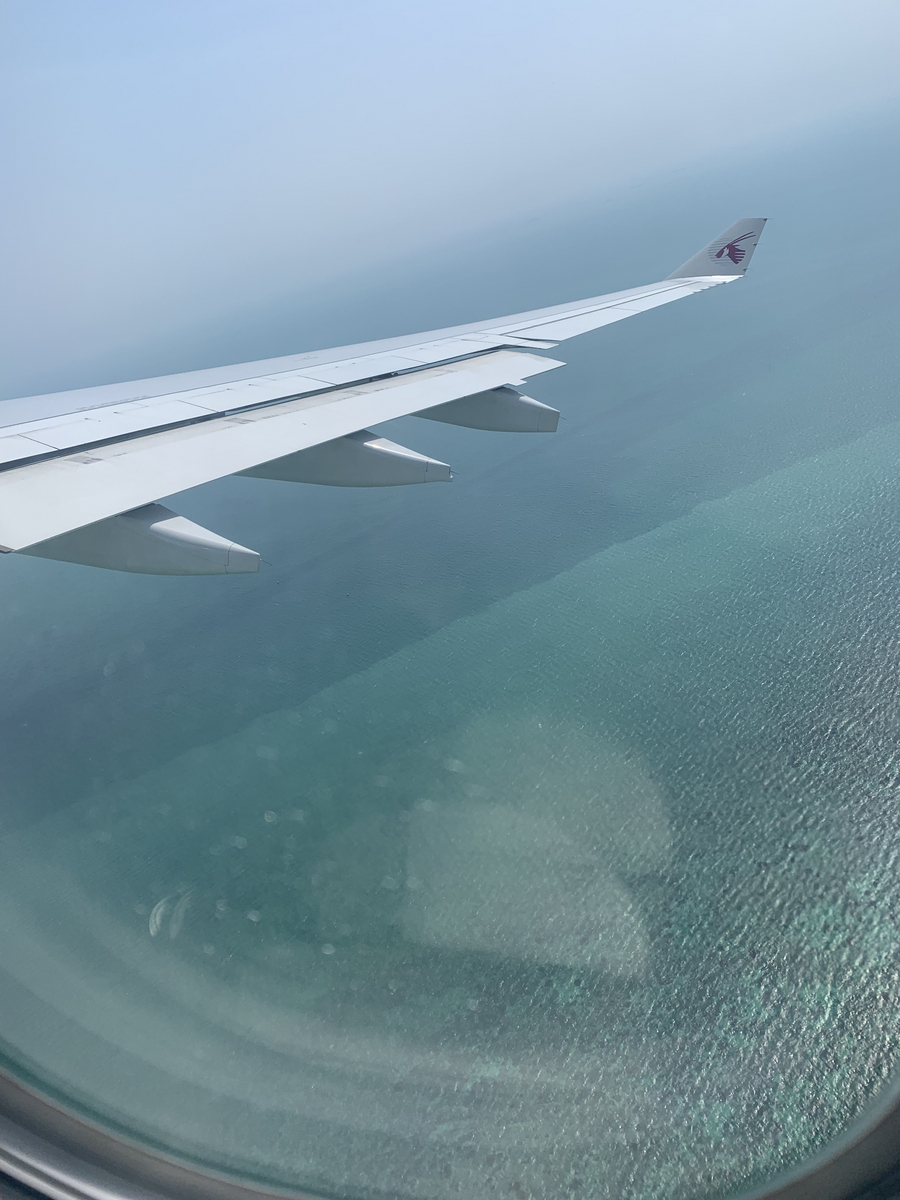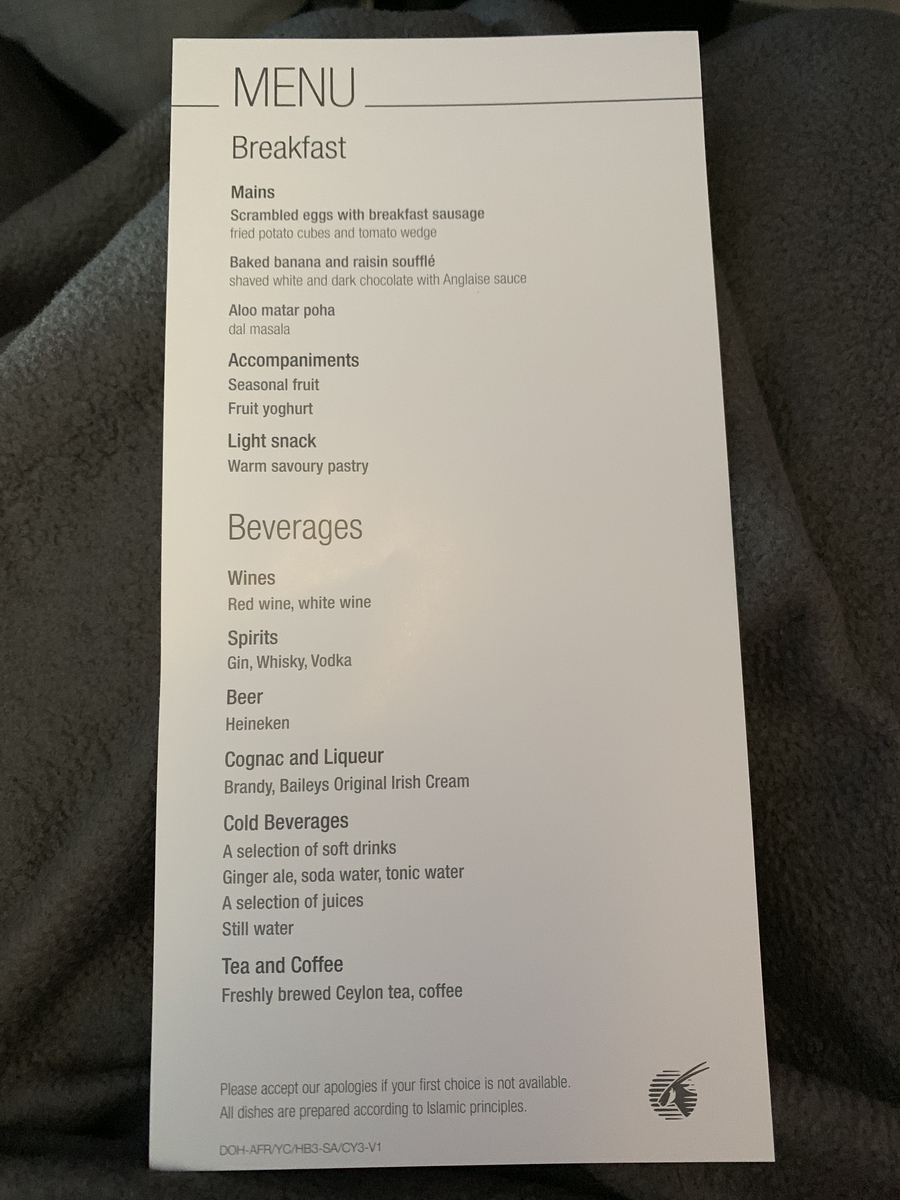 こちらはカタール航空の機内食。夜の時間なので、暗い中でご飯を食べる。このラザニアのようなものがとてもおいしかった印象。そして上の方にあるプラスチックの容器に入ったデザートも高級感があって、テンションが上がった。