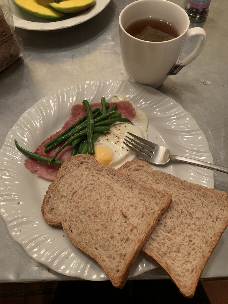 朝ごはんは前日に買ったパンと野菜いためと目玉焼き。