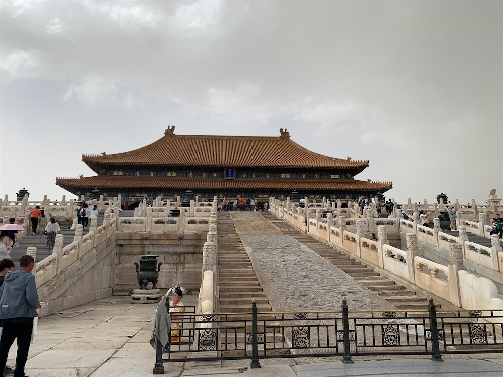 15:00〜17:00 故宫へ。曇りだけど、雨は降らず。適度に風が吹いていい感じ。頤和園と建築の雰囲気が違うところもありつつ、似ているところもあって面白かった。やはり首都北京だからか、 故宫は北京という形がするな~。入り組んだ故宮内も映画やドラマで見た宮廷という感じがして面白い。頤和園の時もそうだったけれど、階段ではないスロープのようなものが入口によくあった。めちゃくちゃ細かい段差があって絶妙に滑り止めになるようなならないような構造でこれはどういう設計意図なのか気になった。